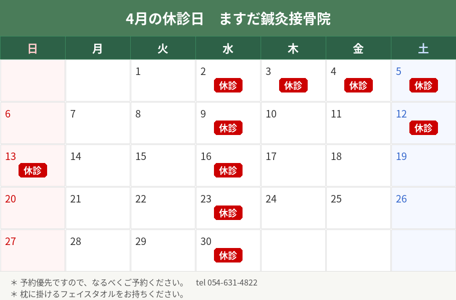 お知らせ 2026.03.19 2026.04.175月の休診日のお知らせ ますだ鍼灸接骨院の営業時間をお知らせします。 月〜金:9:00〜20:00 土日 :9:00〜18:00 定休日 祝日 定休日 お気軽にお電話またはLINEよりご予約ください。 Post Share Hatena Line RSS feedly Pin it note LINEからご予約いただけます前の記事